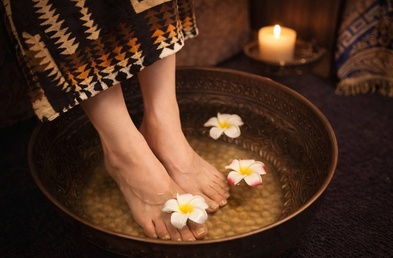 プルメリアの浮かぶブラス製のフットバスにアロマを垂らし、心地よい香りに包まれリラックスタイムを。